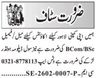 The latest Accountant and Civil Diploma Holder Jobs in Lahore 2026 – Apply Online | dailyjobzalert.com have been announced by Private Company in Lahore Punjab Pakistan through the Daily Jang Newspaper. Candidates with BSc and Bcom qualifications are eligible to apply for these latest Private Company jobs in Pakistan.