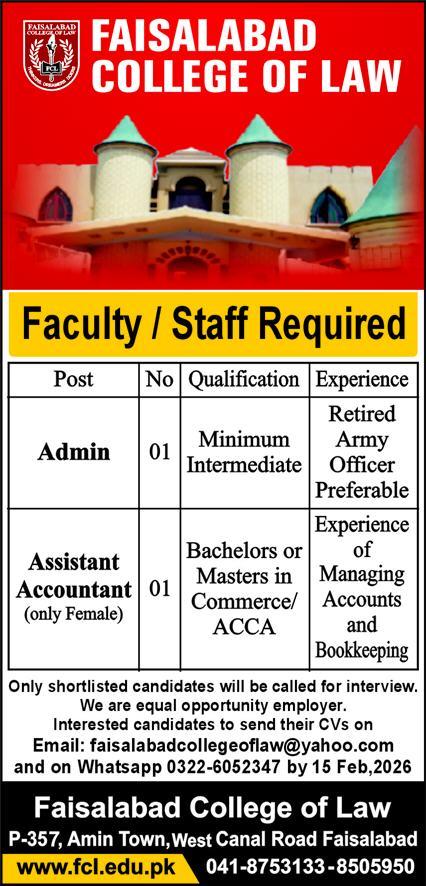 According to a 9 February 2026 advertisement in the daily Express Newspaper, vacancies for assistant accountants and administrators have been posted at Faisalabad College of Law Canal Road Faisalabad, Faisalabad, Punjab Pakistan. Educational qualifications such as Bachelor, Intermediate, and Master are preferred.