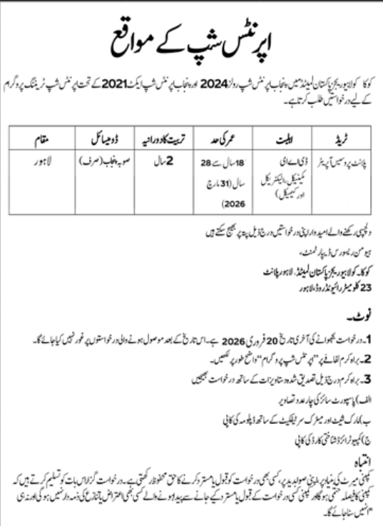 Latest Apprenticeship Jobs in Coca Cola Beverages Pakistan 2026