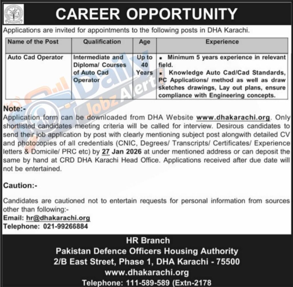 Application form can be downloaded from DHA Website www.dhakarachi.org. Only shortlisted candidates meeting criteria will be called for interview. Desirous candidates to send their job application by post with clearly mentioning subject post alongwith detailed CV and photocopies of all credentials (CNIC, Degrees/ Transcripts/ Certificates/ Experience letters & Domicile/ PRC etc) by 27 Jan 2026 at under mentioned address or can deposite the same by hand at CRD DHA Karachi Head Office. Applications received after due date will not be entertained.