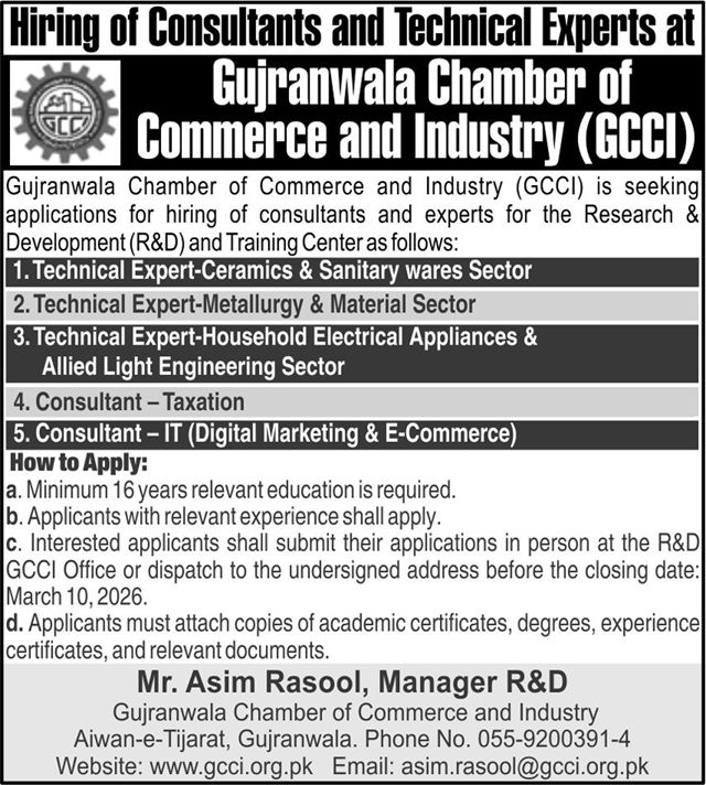 The Gujranwala Chamber of Commerce & Industry (GCCI) is inviting application from qualified and experienced professional for multiple consultants & technical expert position at its Research & Development (R&D) and Training Center in Gujranwala.