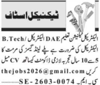 | Summary for Electrical Technician Jobs in Lahore 2026 | ||