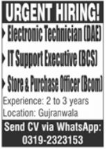 A private company in Gujranwala, Punjab, Pakistan is seeking people for following positions: electronic technician, store and purchase officer, and IT support executive. The job announcement was published in the daily Jang Newspaper on February 15, 2026.