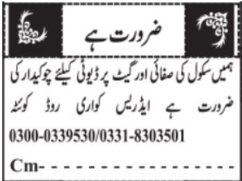 The latest Gate Keeper and Chowkidar Jobs 2026 in Quetta have been announced by Private School in Quetta through the Daily Jang Newspaper. Candidates with Primary, Middle and Matric qualifications are eligible to apply for these latest Private School jobs in Quetta Pakistan.