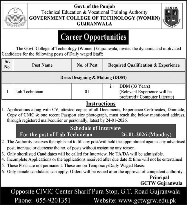 The Government College of Technology Women, (TEVTA) is seeking candidates for the following post: lab technician of Daily waged Staff as per advertised in the Daily Express on 21 January, 2026) in GT Road, Gujranwala, Punjab, Pakistan.