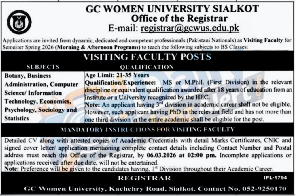 | Keywords: GC Women University Sialkot Jobs 2026 Visiting Faculty Jobs 2026 Pakistan University Teaching Jobs in Sialkot Spring Semester Faculty Jobs 2026 HEC Recognized University Jobs Latest Government University Jobs in Pakistan |