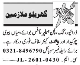 House staff job opportunities have been announced in Lahore through an advertisement published on 16 January 2026 in the Daily Jang Newspaper. Applications are invited from suitable candidates for multiple household positions in Lahore, Punjab, Pakistan.