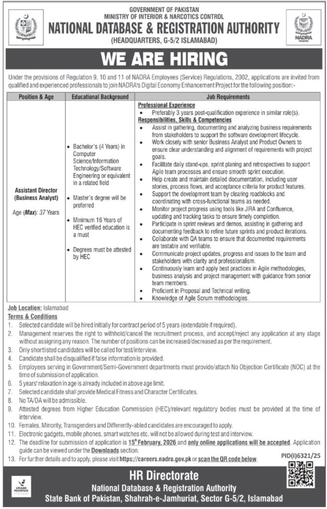 The National Database & Registration Authority (NADRA) has announced new government job opportunities under the Digital Economy Enhancement Project. Applications are invited from qualified and experienced professionals for the post of Assistant Director (Business Analyst). This is an excellent opportunity for candidates looking for latest NADRA jobs 2026 in Islamabad.