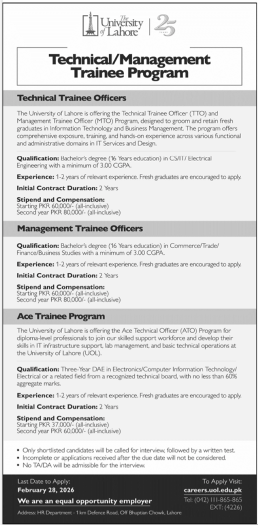 The University of Lahore is offering the Technical Trainee Officer (TTO) and Management Trainee Officer (MTO) Program, designed to groom and retain fresh graduates in Information Technology and Business Management. The program offers comprehensive exposure, training, and hands-on experience across various functional and administrative domains in IT Services and Design