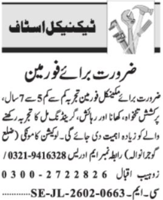| Summary for Mechanical Foreman Jobs in Gujranwala 2026 | ||