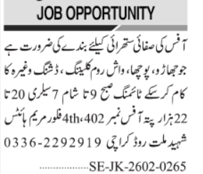 Private Office Shaheed Millat Road Karachi, Sindh Pakistan seeks applications from qualified applicants for positions of office cleaner and office boy, as advertised on 19February, 2026 in the daily Jang Newspaper. Educational requirements include Primary, Middle, Matric, and other qualifications.