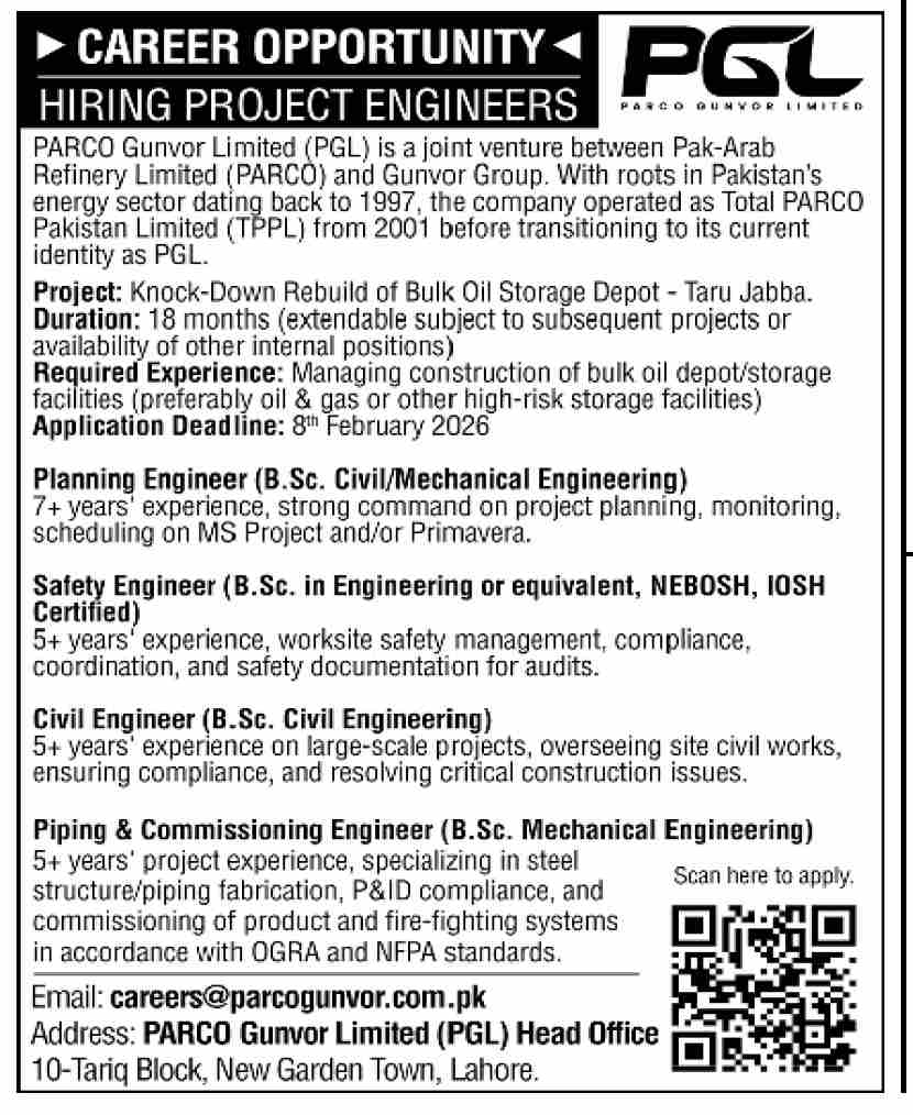 Another major project in Pakistan’s energy sector is about to begin, for which PARCO Gunvor Limited (PGL) has announced recruitment for various Project Engineering positions. This opportunity is for professionals with experience in oil & gas, bulk storage, or large-scale infrastructure projects.
