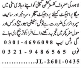 A leading construction company in Lahore, Punjab, Pakistan has announced exciting job openings for various positions, including Surveyor, Site Supervisor, and Project Manager. These vacancies were advertised on January 16, 2026, in the Daily Jang Newspaper.