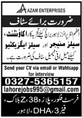 Azam Enterprises Lahore, are announced new jobs including accountant, sales executive and sales manager as per advertisement in daily Jang Newspaper ( 18 January 2026 ).