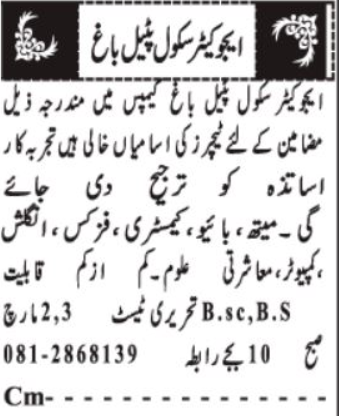 The latest Science Teacher Jobs 2026 have been announced by The Educators in Quetta, Pakistan through the Daily Jang Newspaper. Candidates with Bachelor and Master Degree qualifications are eligible to apply for these latest Science Teacher Jobs in Quetta 2026.