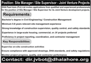 To apply for this Site Manager and Site Supervisor post at DHA Pearl Axis (Pvt) Ltd,candidates must have Bachelor degree in Civil Engineering or Construction Management along with relevant fields experience.
