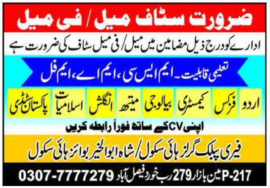The latest Teaching Jobs in Faisalabad 2026 have been announced by Fairy Public Girls High School in Faisalabad through the  daily Express Newspaper. Candidates with Mphil, M.sc and MA qualifications are eligible to apply for these latest Fairy Public Girls High School jobs in Faisalabad Pakistan.