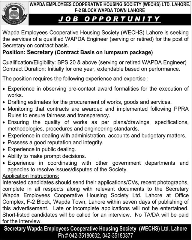 According to this Advertisement,Wapda Employees Cooperative Housing Society WECHS Lahore wants to hire qualified WAPDA Engineer serving or retired for position of Secretary on contract basis.This roles is very responsible which involve important tasks like Management,Administration,Financial oversight & coordination.